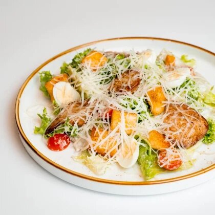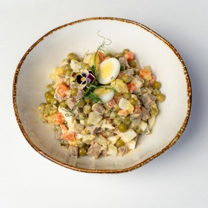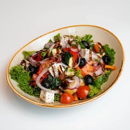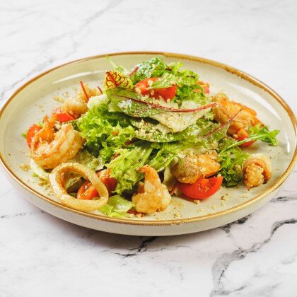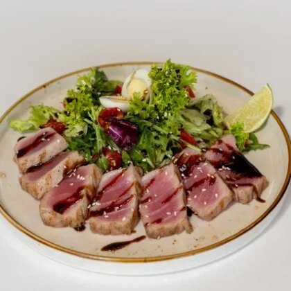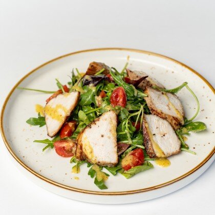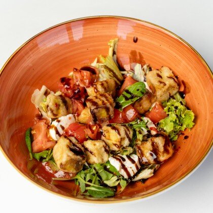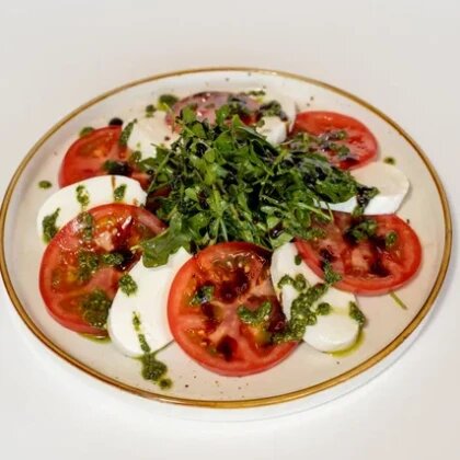 Говядина вырезка, сыр "Дорблю", шампиньоны, микс салата, помидоры черри соус песто, сливки, соус бальзамик
