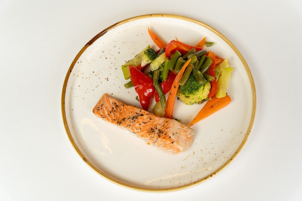 Сочные розовые стейки форели аккуратно уложены на тарелке с яркими овощами на пару. В составе: филе форели, брокколи, фасоль стручковая, перец болгарский, морковь, цукини, масло оливковое, зелень.