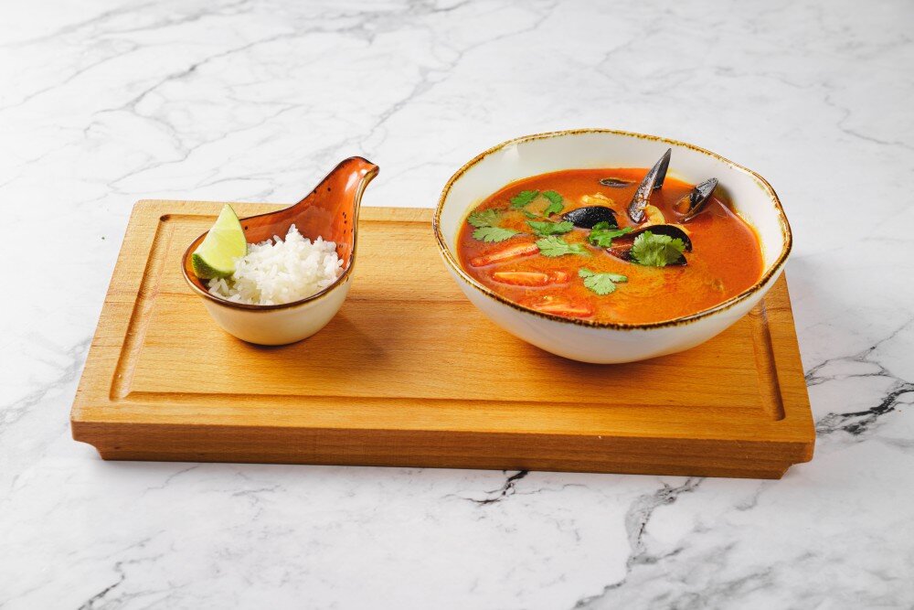 Куриный бульон,кокосовое молоко,мидии,тигровые креветки,кальмар,грибы,помидоры черри,рис