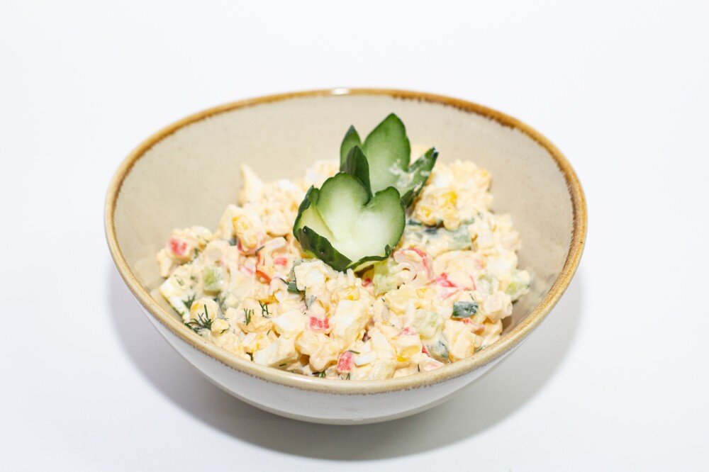 Крабовые палочки,огурец,кукуруза,яйцо,майонез.