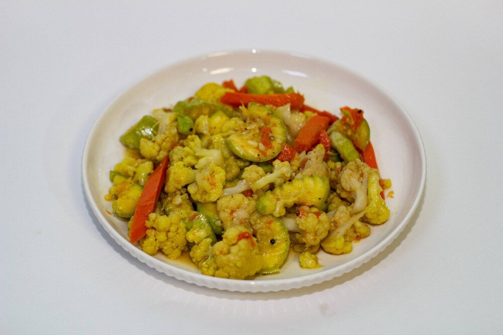 цветная капуста, морковь, кабачок, перец болгарский, фирменный маринад.