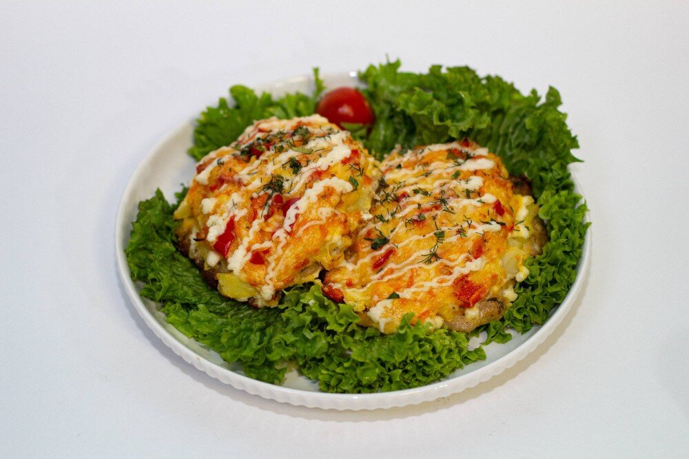 отбивная из свинины, картофель, морковь, сыр моцарелла.