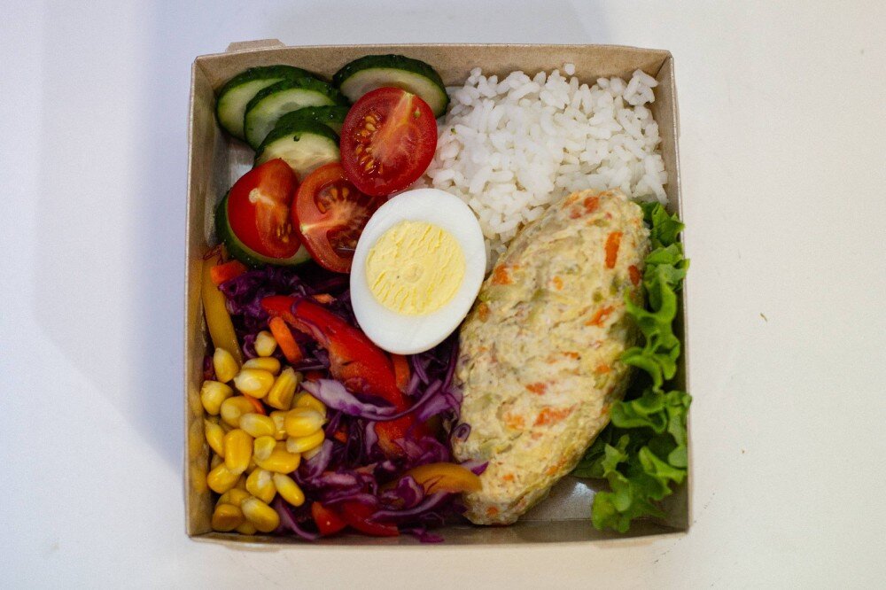 Рис отварной, куриная котлета с кабачком, яйцо, свежий огурец, помидор черри, капуста, кукуруза,болгарский перец, морковь.