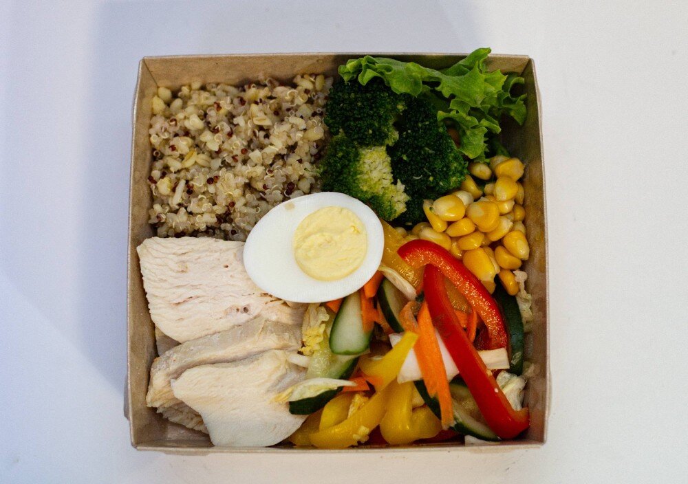 Булгур с киноа, курица на пару, яйцо, свежий огурец, помидор черри, брокколи,кукуруза, пекинская капуста, болгарский перец, морковь, лист айсберга.