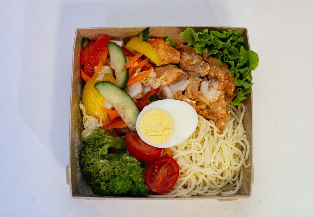 Рисово-кукурузные макароны, курица, яйцо, свежий огурец, помидор черри, брокколи, пекинская капуста, морковь,болгарский перец, лист айсберга.