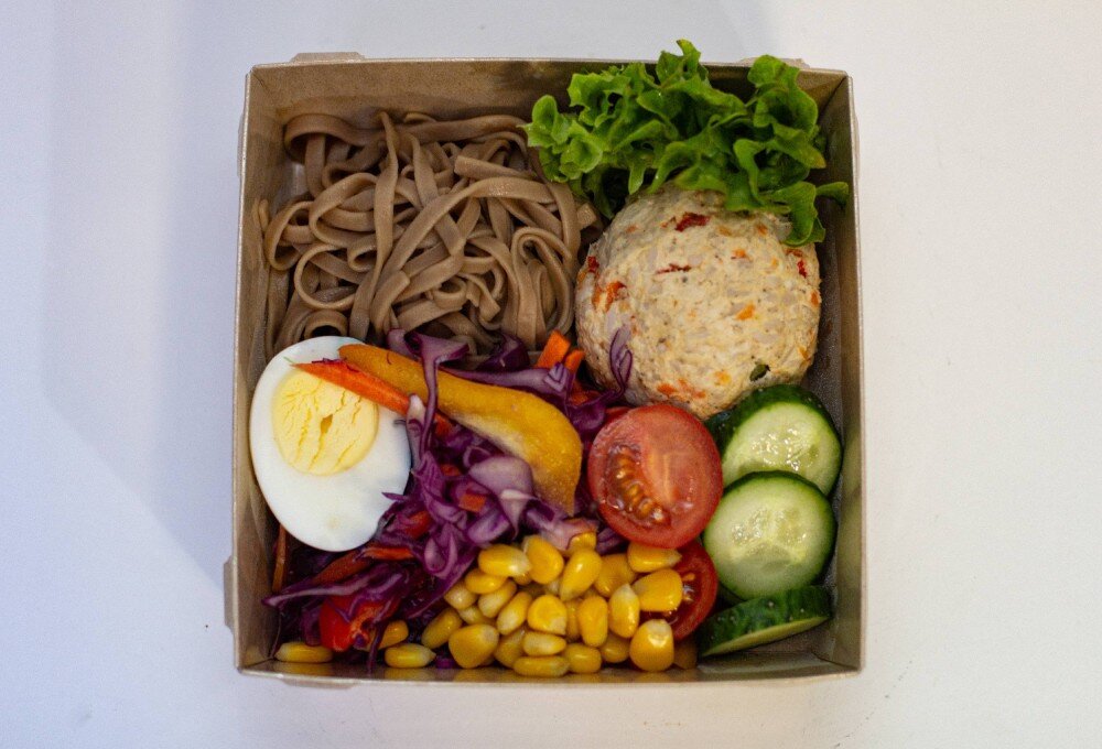 Гречневая лапша, куриная котлета, яйцо, свежий огурец, помидор черри, кукуруза, капуста, болгарский перец, морковь, лист айсберга.